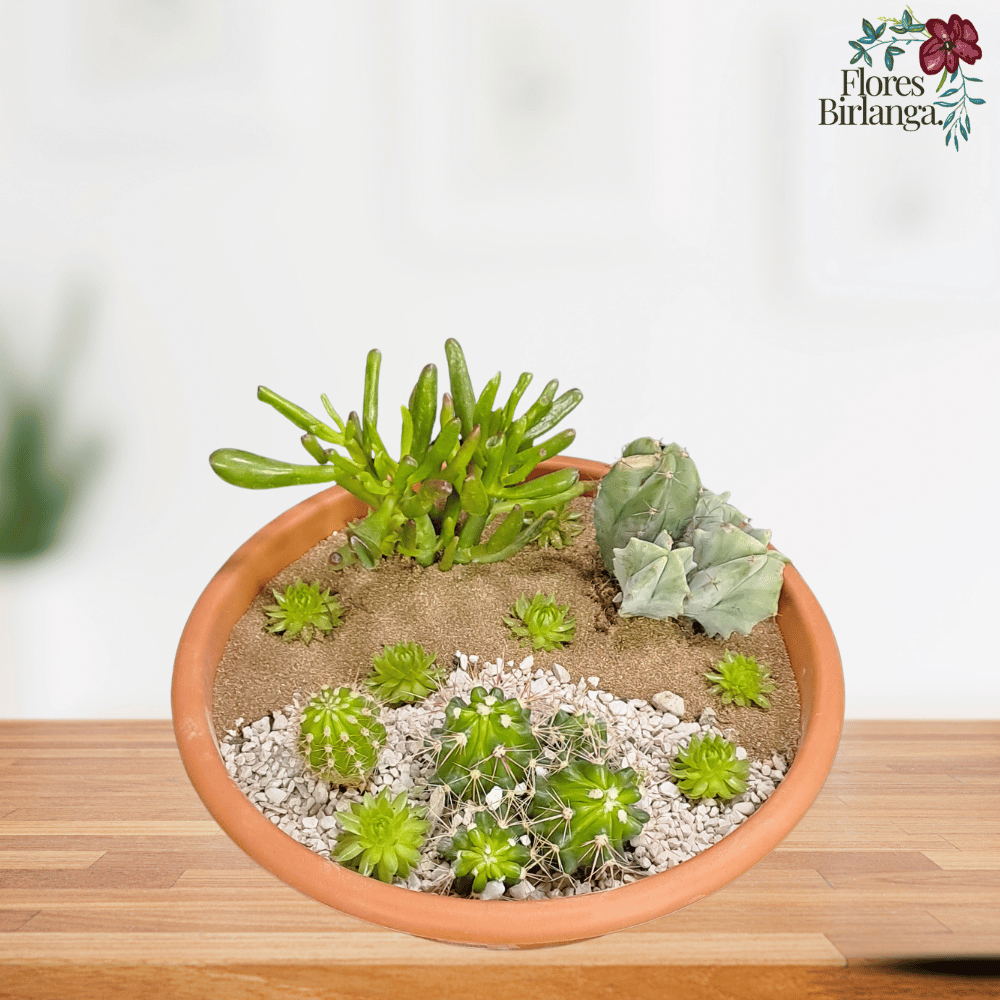 Este arreglo combina la belleza escultural de las suculentas con la fuerza visual de los cactus, creando una pieza decorativa que evoca la serenidad de los paisajes áridos. Presentado en una maceta de terracota, el diseño juega con contrastes de color y textura en el sustrato, dividiendo el suelo entre arena fina marrón y grava blanca, para un acabado moderno y natural.